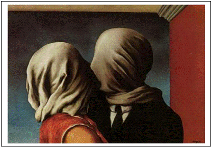 A imagem reproduz uma obra de René Magritte, um dos principais artistas surrealistas belgas. Entre a pintura e o texto “O amor é cego – literalmente” há uma aproximação quanto