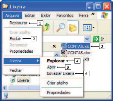 Para retirar da Lixeira, mostrada na Figura 2, apenas o arquivo apontado pela seta nº 3 e restituí-lo ao local onde se encontrava antes de ser excluído, basta selecionar o item de menu apontado pela seta nº