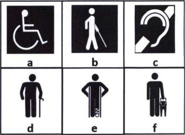 A NBR 9050 trata da acessibilidade a edificações, mobiliário, espaços e equipamentos urbanos. Nela estão explicitados os símbolos que correspondem à acessibilidade na edificação e prestação de serviços, como, por exemplo, os símbolos a seguir.