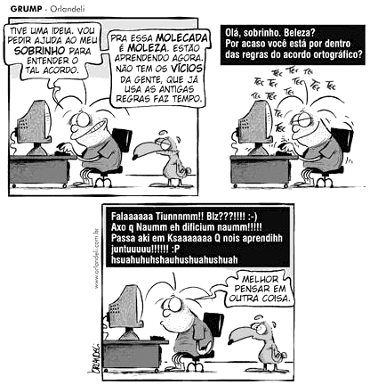 A partir da análise da escrita do último quadrinho do texto III, assinale a alternativa incorreta quanto à identidade da escrita em textos virtuais.