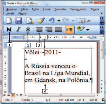 As questões 25 e 26 baseiam-se na Figura 4, do Word 2003, a partir da qual se pode observar que se elaborou um documento, em que a seta nº 4 aponta para o ponto de inserção de texto no formato de uma barra vertical (" | "). Nessa Figura, após ter sido digitada a palavra apontada pela seta nº 5, o Word 2003 inseriu, automaticamente, embaixo dessa palavra, uma linha ondulada de cor vermelha.