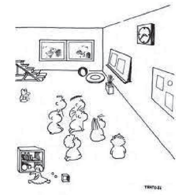 A imagem acima, de autoria de Francesco Tonucci faz referência à organização do espaço em instituições de educação infantil, ou salas de educação infantil em escolas.Avalie as sentenças abaixo e coloque (V) para verdadeiro e (F) para falso.