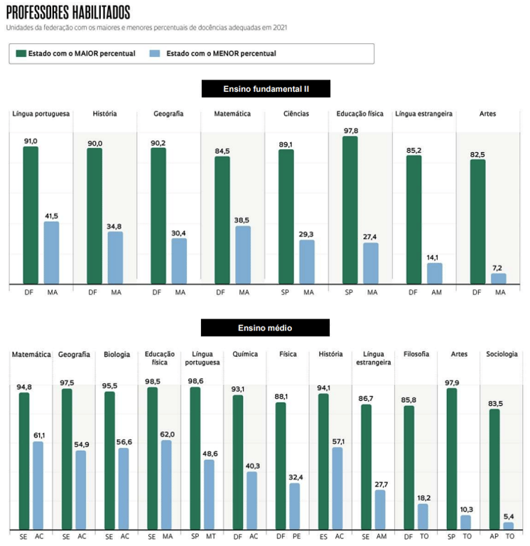 Preocupados em mensurar se as defasagens poderiam ser sanadas com a contratação de profissionais graduados em licenciaturas no Brasil nos últimos anos, pesquisadores do Inep realizaram, em setembro, estudo no qual olharam para as carências de escolas públicas e privadas nos anos finais do ensino fundamental e médio. “Se todos os licenciados de 2010 a 2021 ministrassem aulas na disciplina em que se formaram nos anos finais do ensino fundamental e no ensino médio em 2022, ainda assim o país teria dificuldades para suprir a demanda por docentes de artes em 15 estados, física em cinco, sociologia em três, matemática, língua portuguesa, língua estrangeira e geografia em um”, contabiliza Alvana Bof, uma das autoras da pesquisa. Além disso, o estudo avaliou se a quantidade de licenciados de 2019 a 2021 seria suficiente para suprir todas as docências que, em 2022, estavam sendo oferecidas por professores sem formação adequada. Foi constatado que faltariam docentes de artes em 18 estados, física em 16 estados, língua estrangeira em 15, filosofia e sociologia em 11, matemática em 10, biologia, ciências e geografia em 8, língua portuguesa em 5, história e química em 2 e educação física em um estado. “Os resultados indicam que já vivemos um apagão de professores em diferentes estados e disciplinas”, reitera Bof, licenciada em letras e com doutorado em educação.