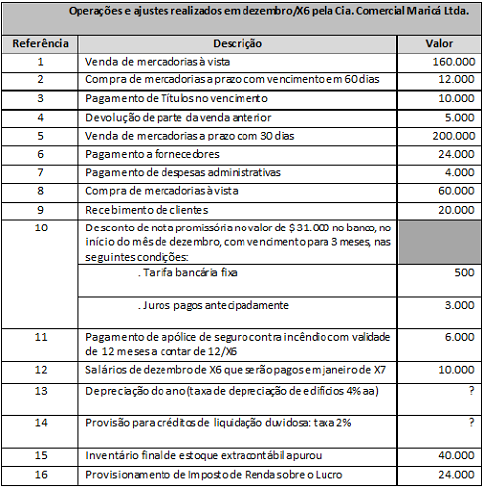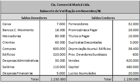 Para responder às próximas 5 (cinco) questões, considere o Balancete de Verificação em novembro/X6 a seguir e as operações/ajustes realizados em dezembro/X6 para apurar o Resultado do Exercício e elaborar o Balanço Patrimonial Final em dezembro/X6 da Cia. Comercial Maricá Ltda.