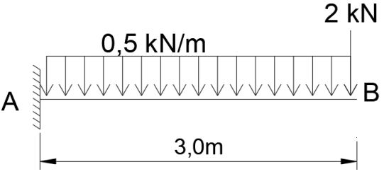 Para responder às questões 21 a 24, considere a Figura 1, que representa uma viga engastada em balanço com um carregamento distribuído de 0,5 kN/m em todo seu comprimento e um carregamento pontual em sua extremidade (ponto B) de 2 kN.