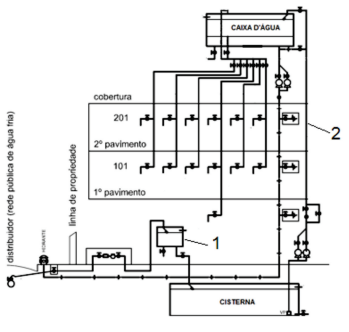 A figura a seguir apresenta o diagrama vertical da instalação de água fria de um pequeno edifício. Sobre essa instalação, responda às duas próximas questões.