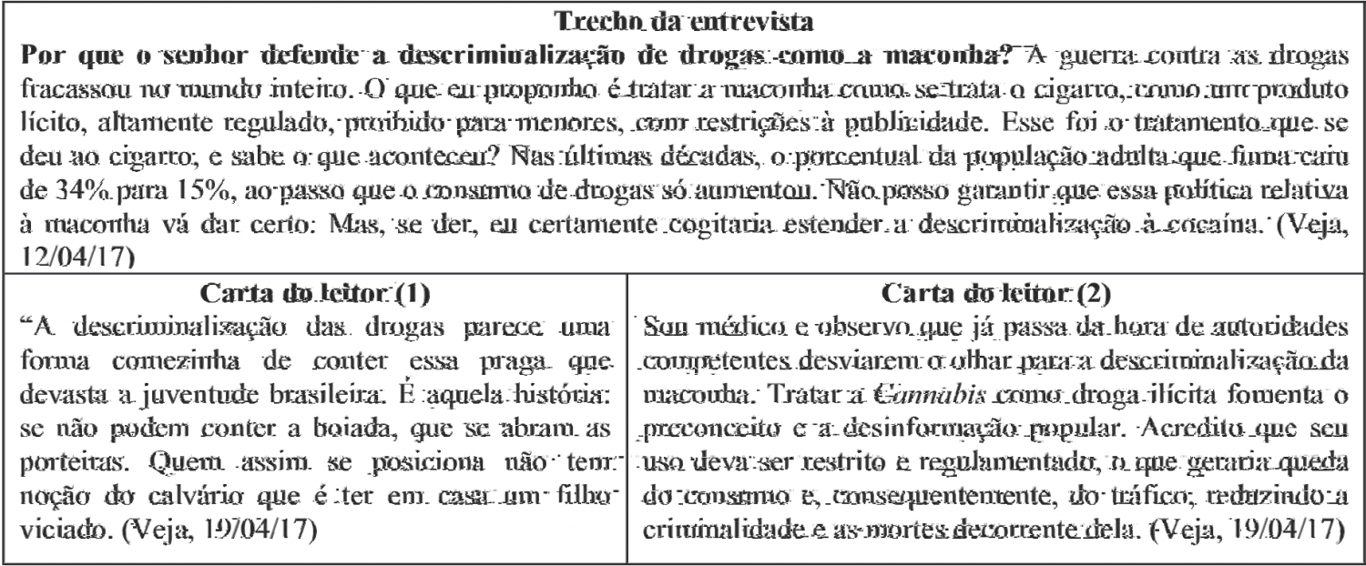 Abaixo estão dispostos três textos — o primeiro, um trecho da entrevista com o ministro Roberto Cardoso no qual ele se posiciona em relação à descriminalização da maconha, e os outros dois, comentários em relação à proposta do ministro, expostos na seção “Carta do leitor”, todos retirados da revista Veja. Leia-os de forma a responder às questões (01), (02) e (03):