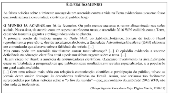 V- [...] Com uma atitude mais séria em relação à comunicação científica e participação do público, talvez os jornais deem maior destaque às descobertas realizadas no Brasil. Assim, não seríamos tão facilmente surpreendidos por falsas notícias sobre o “o fim do mundo” — que, ao contrário do asteroide 2016 WF9, não têm nada de inofensivas.