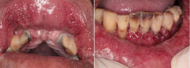 Paciente, 54 anos de idade, trabalhador rural e tabagista, procurou atendimento odontológico apresentando lesões sintomáticas, com aspecto de pontilhado hemorrágico, em cavidade bucal. Relata que as lesões tiveram início há 40 dias, apresentando uma piora clínica. Relata dificuldade de realizar higiene bucal e cansaço ao mínimo esforço. As imagens clínicas são as seguintes: