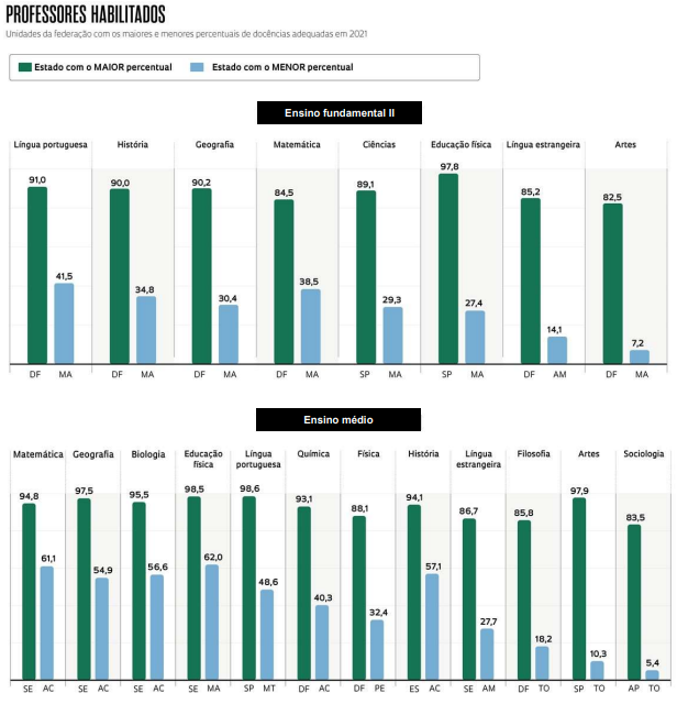 Preocupados em mensurar se as defasagens poderiam ser sanadas com a contratação de profissionais graduados em licenciaturas no Brasil nos últimos anos, pesquisadores do Inep realizaram, em setembro, estudo no qual olharam para as carências de escolas públicas e privadas nos anos finais do ensino fundamental e médio. “Se todos os licenciados de 2010 a 2021 ministrassem aulas na disciplina em que se formaram nos anos finais do ensino fundamental e no ensino médio em 2022, ainda assim o país teria dificuldades para suprir a demanda por docentes de artes em 15 estados, física em cinco, sociologia em três, matemática, língua portuguesa, língua estrangeira e geografia em um”, contabiliza Alvana Bof, uma das autoras da pesquisa. Além disso, o estudo avaliou se a quantidade de licenciados de 2019 a 2021 seria suficiente para suprir todas as docências que, em 2022, estavam sendo oferecidas por professores sem formação adequada. Foi constatado que faltariam docentes de artes em 18 estados, física em 16 estados, língua estrangeira em 15, filosofia e sociologia em 11, matemática em 10, biologia, ciências e geografia em 8, língua portuguesa em 5, história e química em 2 e educação física em um estado. “Os resultados indicam que já vivemos um apagão de professores em diferentes estados e disciplinas”, reitera Bof, licenciada em letras e com doutorado em educação.