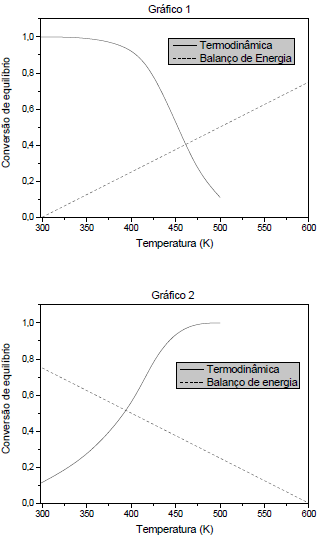 A natureza energética da reação exibida no gráfico 1, bem como as informações fornecidas pelo intercepto entre as curvas termodinâmica e do balanço de energia são, respectivamente: