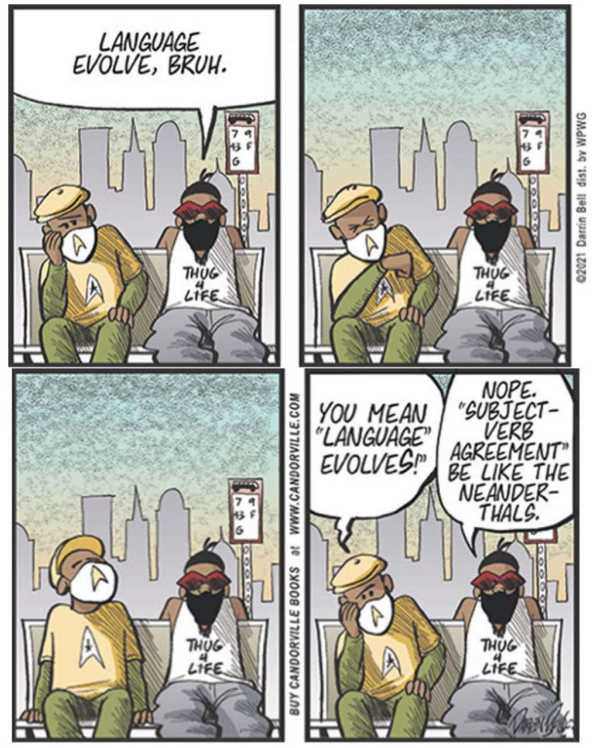 Source: Darrin Bell, Candorville, March 13th, 2021. Available on: htips://candorville.com/2021/03/13/the-evolution-oflanguage/
