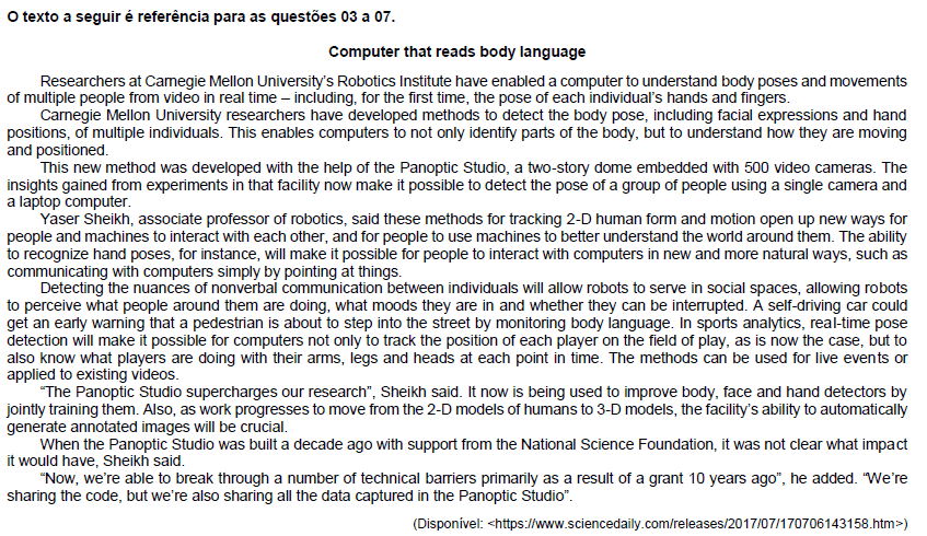 Esta questão foi aplicada no ano de 2017 pela banca NC-UFPR no concurso para ITAIPU BINACIONAL. A questão aborda conhecimentos da disciplina de Língua Inglesa, especificamente sobre Compreensão de Texto.