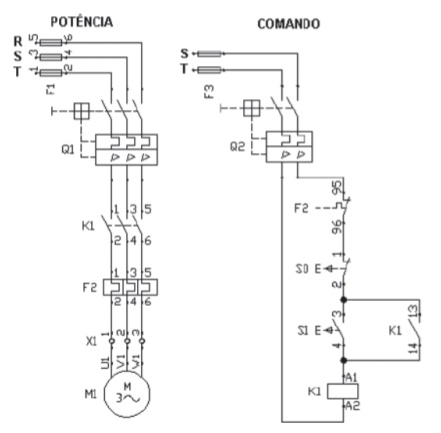 A figura abaixo mostra o diagrama elétrico de potência e comando de um comando manual para acionamento de motor elétrico de indução trifásico.