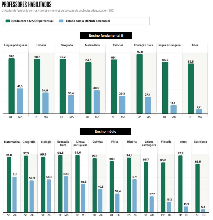 Preocupados em mensurar se as defasagens poderiam ser sanadas com a contratação de profissionais graduados em licenciaturas no Brasil nos últimos anos, pesquisadores do Inep realizaram, em setembro, estudo no qual olharam para as carências de escolas públicas e privadas nos anos finais do ensino fundamental e médio. “Se todos os licenciados de 2010 a 2021 ministrassem aulas na disciplina em que se formaram nos anos finais do ensino fundamental e no ensino médio em 2022, ainda assim o país teria dificuldades para suprir a demanda por docentes de artes em 15 estados, física em cinco, sociologia em três, matemática, língua portuguesa, língua estrangeira e geografia em um”, contabiliza Alvana Bof, uma das autoras da pesquisa. Além disso, o estudo avaliou se a quantidade de licenciados de 2019 a 2021 seria suficiente para suprir todas as docências que, em 2022, estavam sendo oferecidas por professores sem formação adequada. Foi constatado que faltariam docentes de artes em 18 estados, física em 16 estados, língua estrangeira em 15, filosofia e sociologia em 11, matemática em 10, biologia, ciências e geografia em 8, língua portuguesa em 5, história e química em 2 e educação física em um estado. “Os resultados indicam que já vivemos um apagão de professores em diferentes estados e disciplinas”, reitera Bof, licenciada em letras e com doutorado em educação.