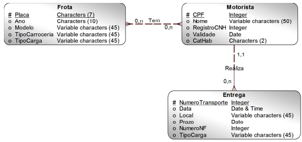 INSTRUÇÃO: As questões 23 e 24 estão baseadas na figura abaixo que é um modelo Entidade-Relacionamento simplificado para controle de entrega de carga em uma empresa de transportes.